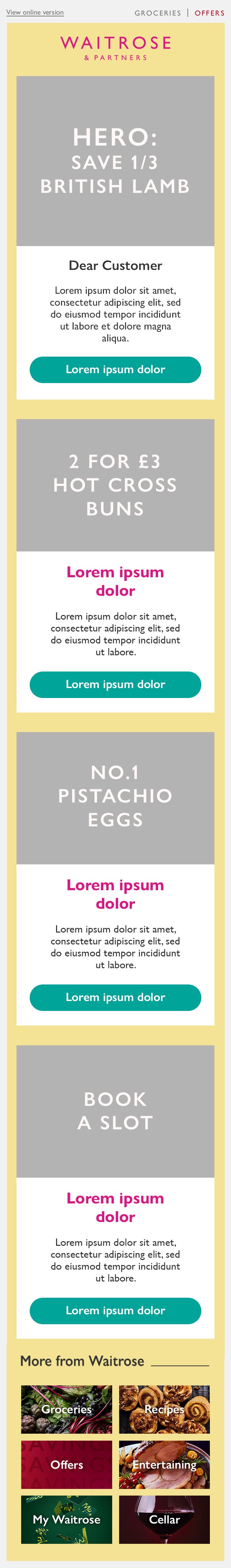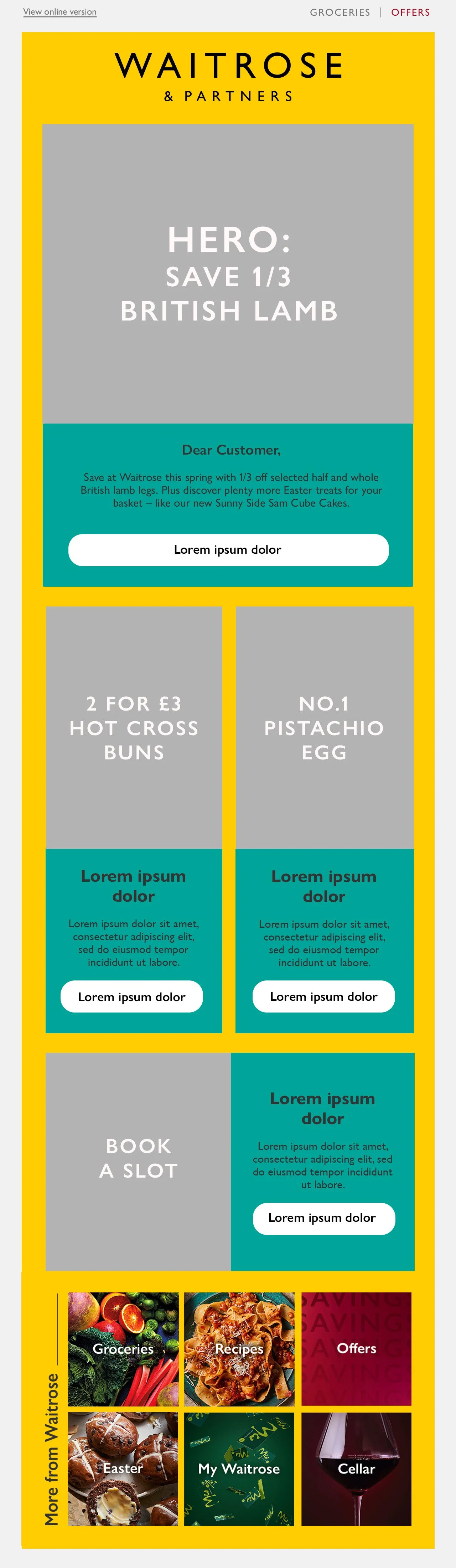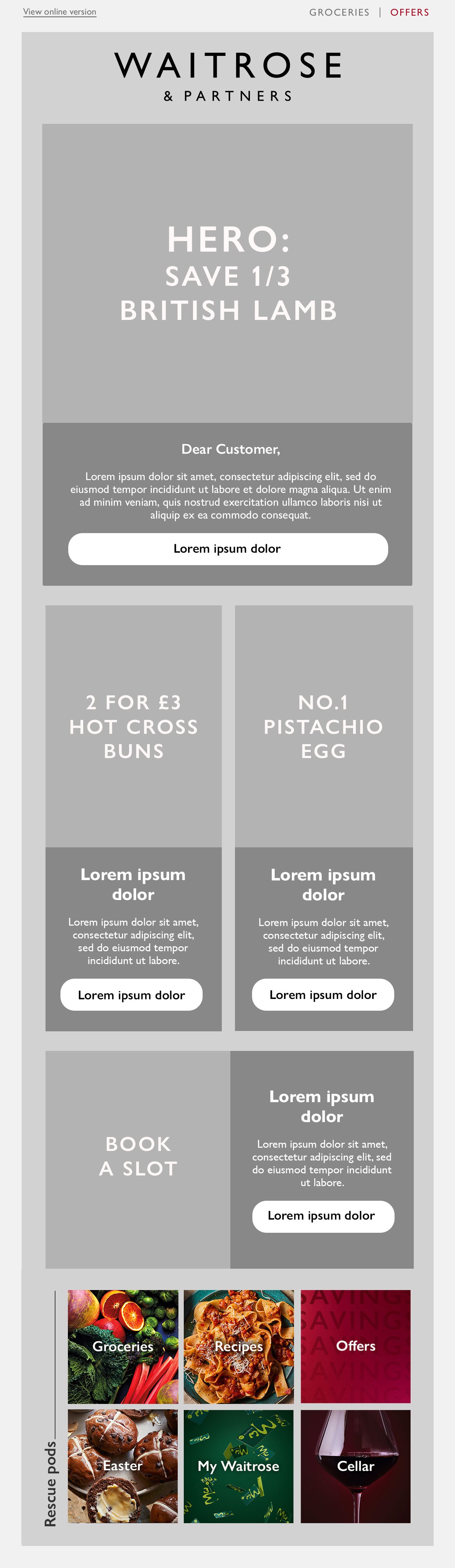 The wireframe outlines the contents of the email based on what the CRM team requested. The hero of the email features the British Roast Lamb offer, the headlining product for this campaign. Following the hero is a 2-column pod platforming the hot cross buns and the No.1 Pistachio Egg. Then there’s a pod requesting customers to book a slot to receive their Easter orders, and rescue pods that allow customers to explore different areas of the website.