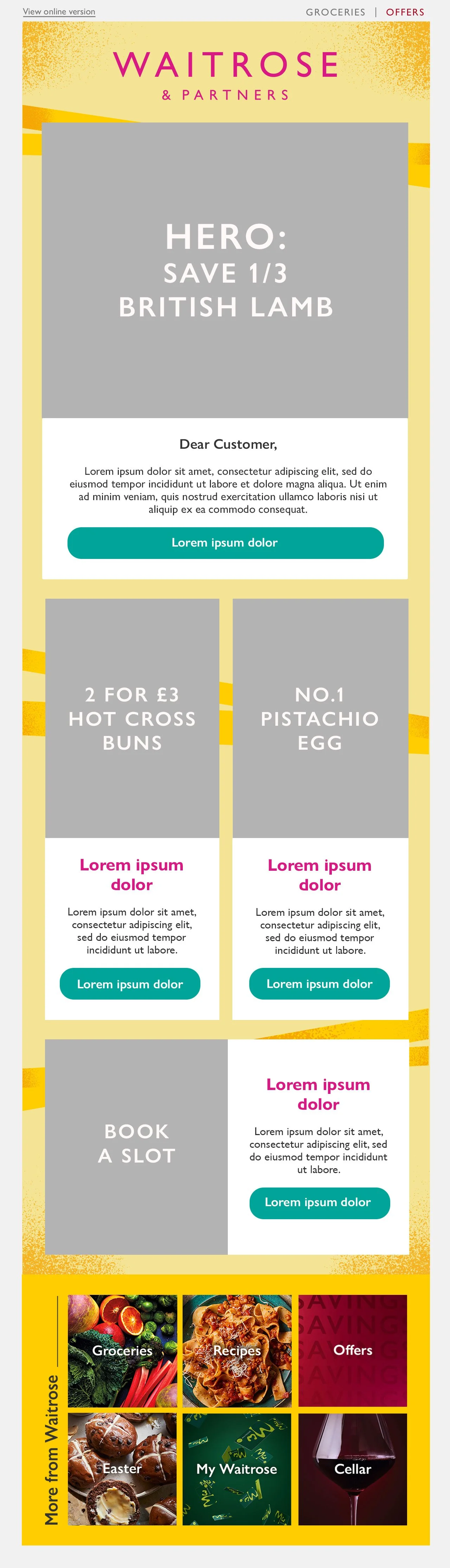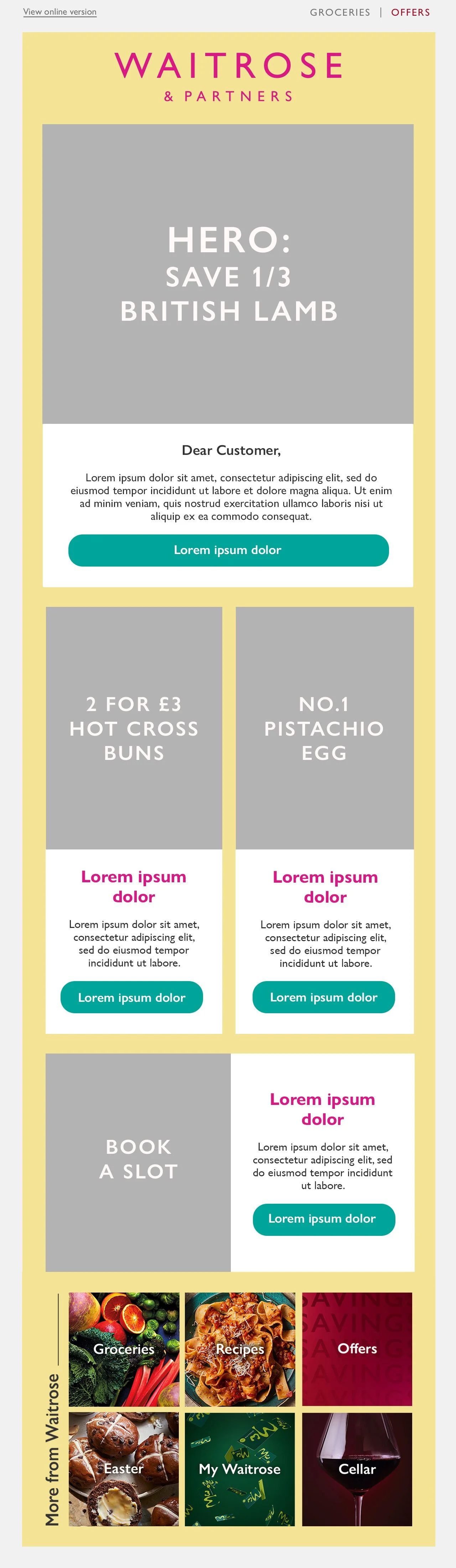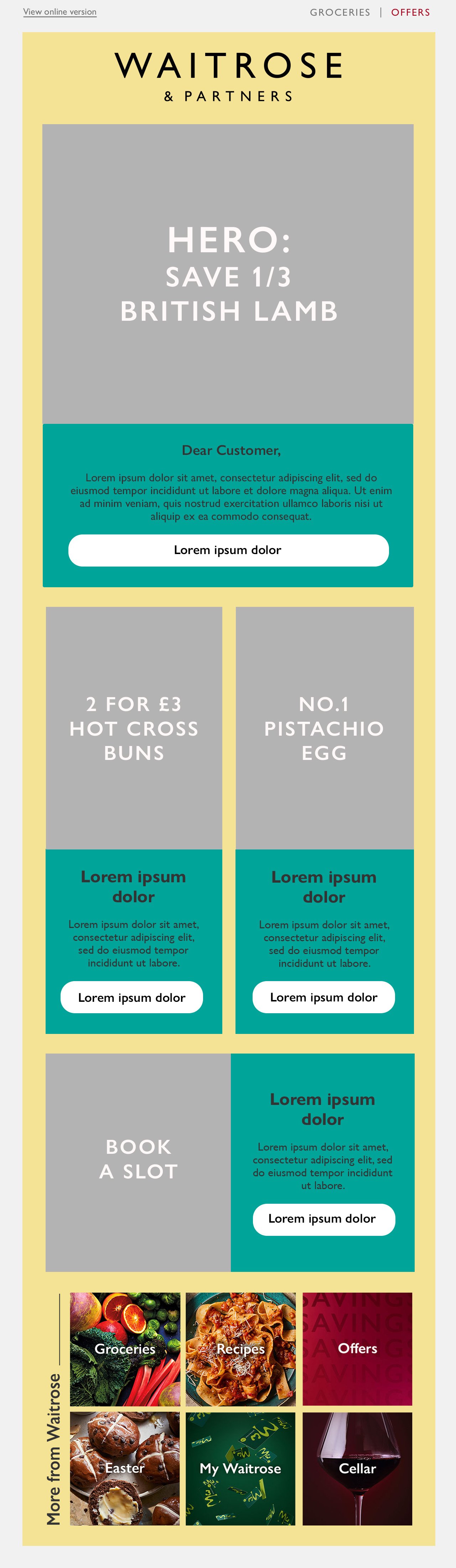 The wireframe outlines the contents of the email based on what the CRM team requested. The hero of the email features the British Roast Lamb offer, the headlining product for this campaign. Following the hero is a 2-column pod platforming the hot cross buns and the No.1 Pistachio Egg. Then there’s a pod requesting customers to book a slot to receive their Easter orders, and rescue pods that allow customers to explore different areas of the website.