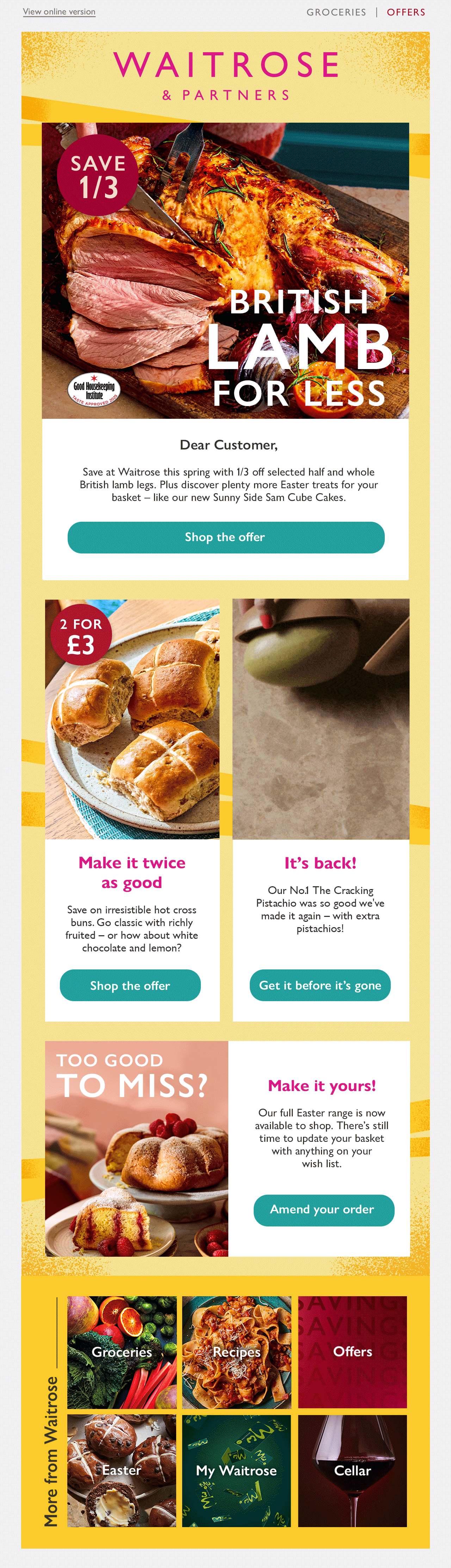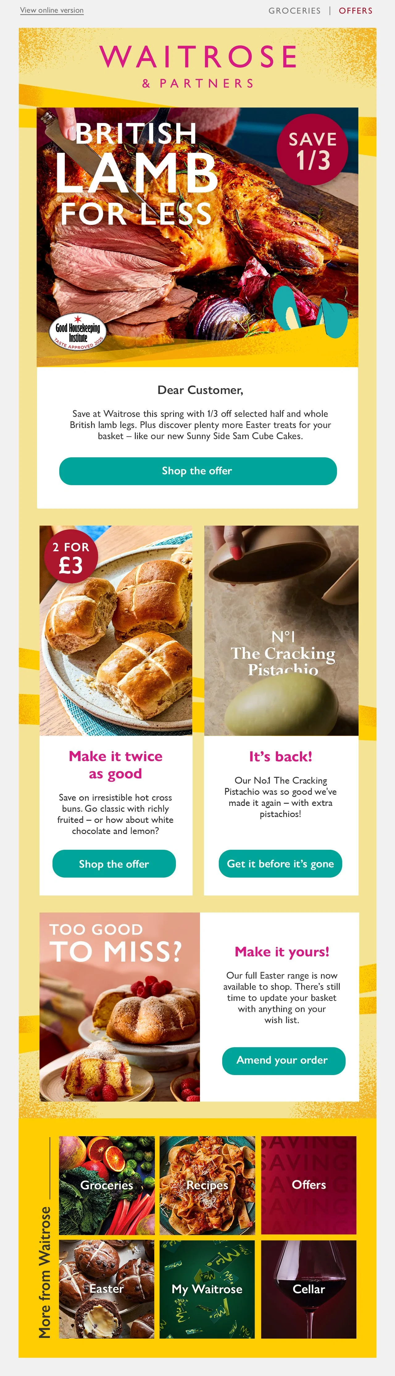 Getting to the final Easter email design was a process of analysing past performance data and refining towards a solution that balanced accessibility, storytelling, and CRM targets. Emails remain one of the few direct ways to reach millions of Waitrose customers, but in an inbox crowded with competing messages, the main challenge is earning attention and driving engagement. The iterations I explored showcase the different approaches I took to overcome this challenge and guide customers towards meaningful interaction with the campaign.