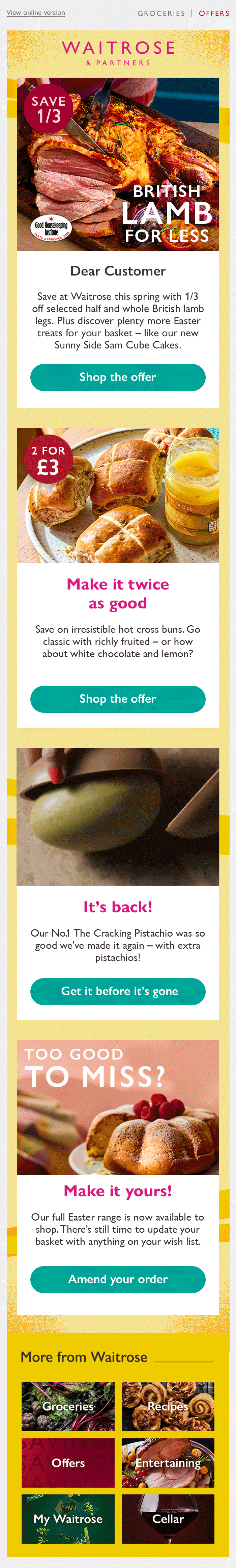 Based of on this design, 4 different versions of the email were required as they would be personalised based on a customer’s order history and dietary requirements. For example, vegetarians were shown a roast offer in the hero that didn’t feature any meat, and for customers who had recently shopped the No.1 Pistachio Egg, they were shown the No.1 Flat Egg to encourage product discovery and add to baskets. These were all factors that contributed to the success of the email as it achieved a 4.34% click-through rate, a significant jump from the year before due to the email’s user-centric experience.