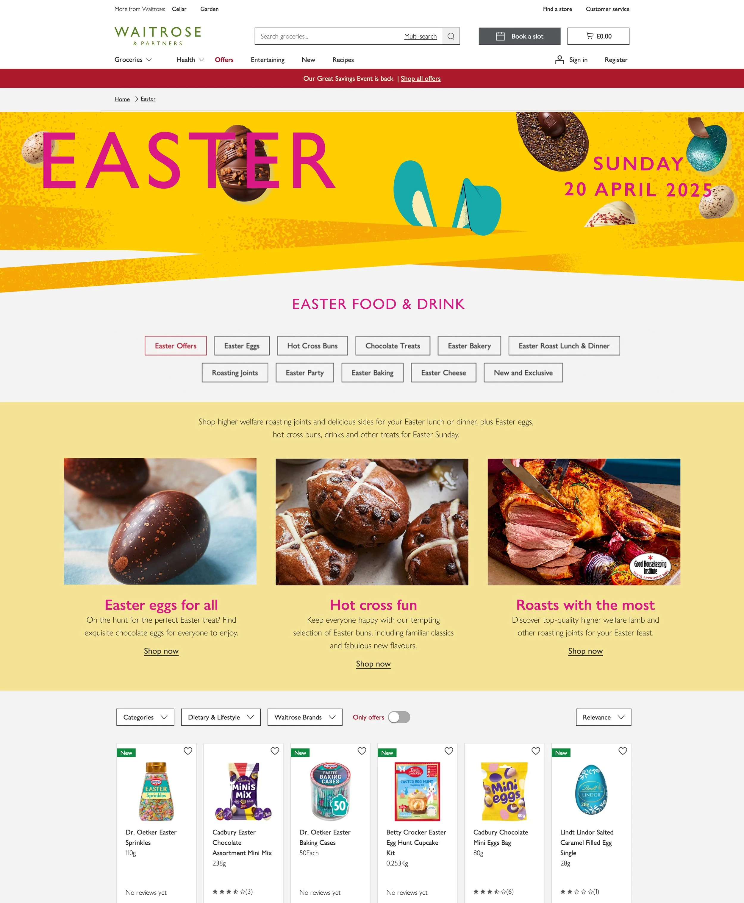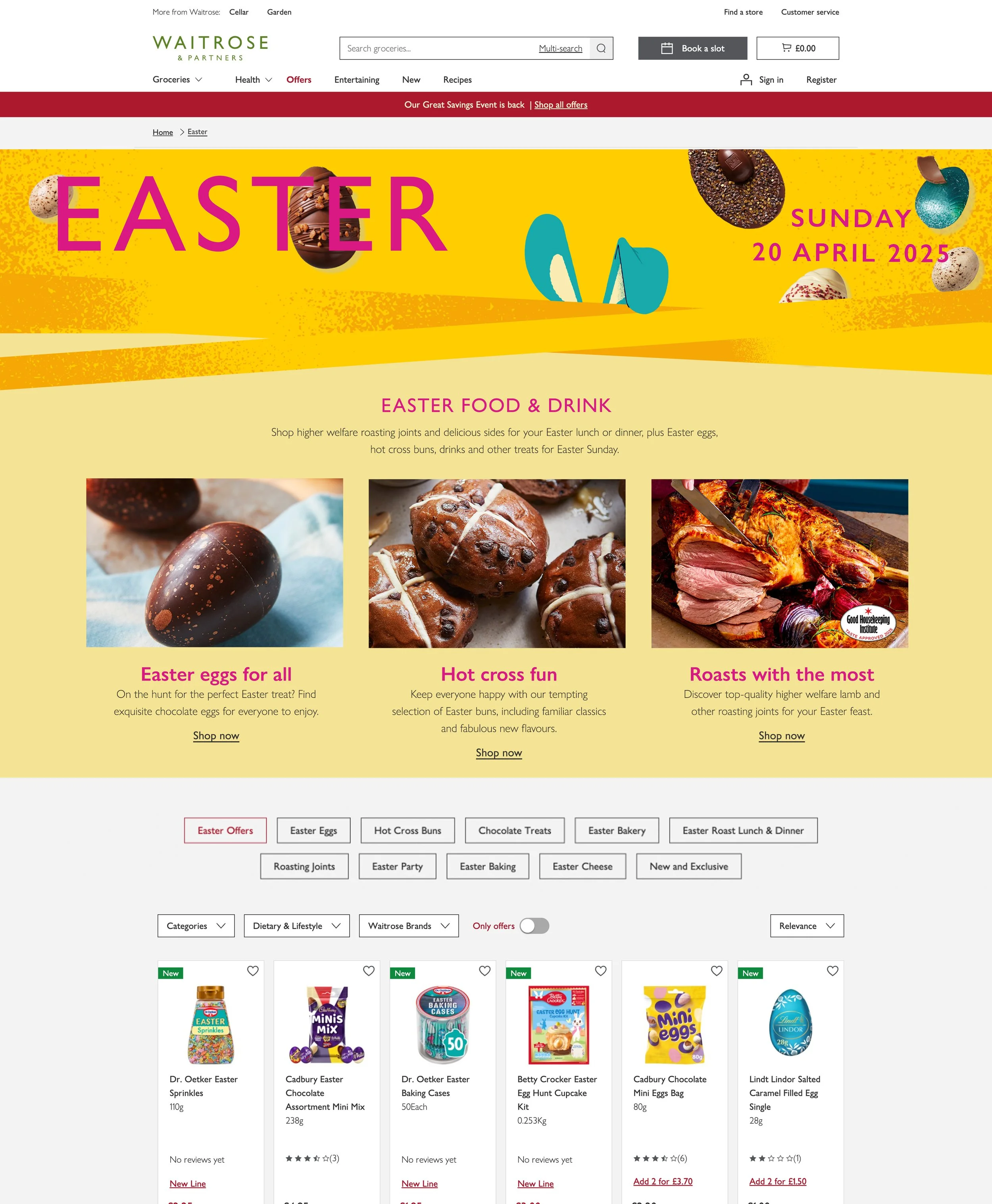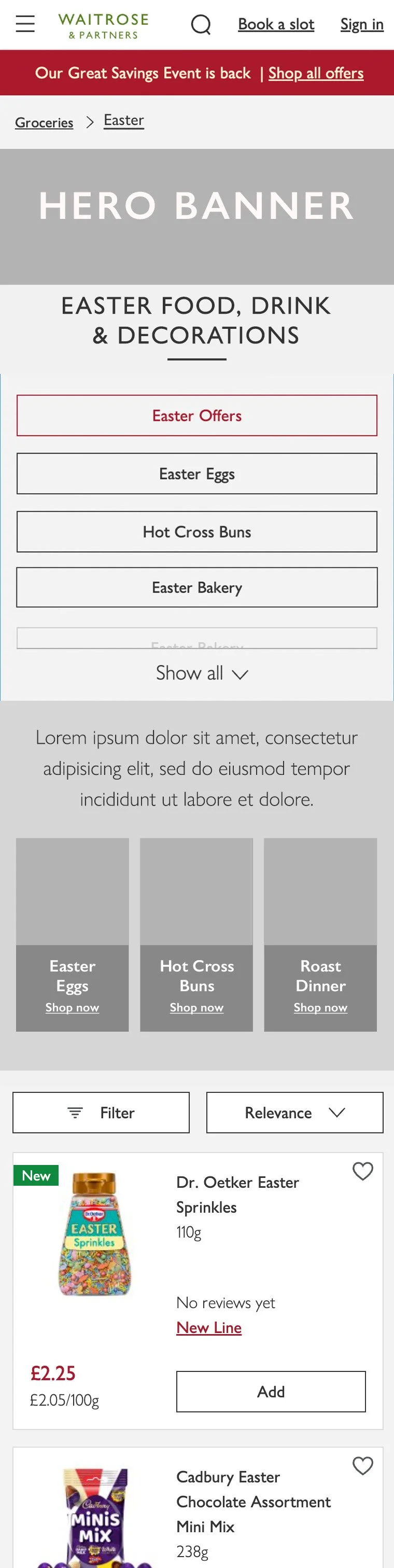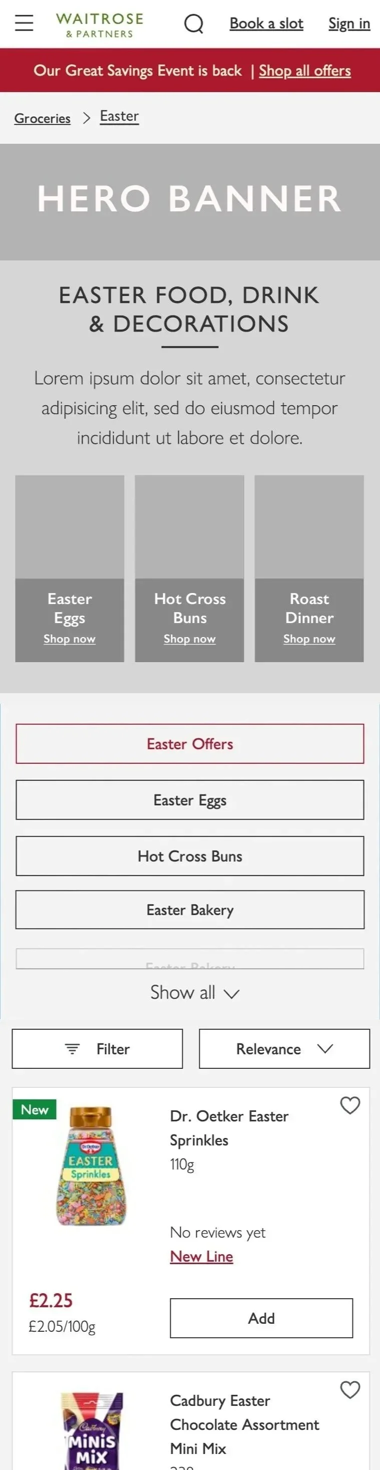 Easter is one of Waitrose’s biggest seasonal moments, with high visibility online and in-store. My role was to design a landing page that not only celebrated the festive theme but also guided users seamlessly from inspiration to purchase. This section of my portfolio focuses on the iterations I explored during the design process of the Easter Landing page, from initial concepts to the final data-informed solution. These iterations demonstrate how different design directions were tested, refined, and aligned with both user needs and commercial goals.