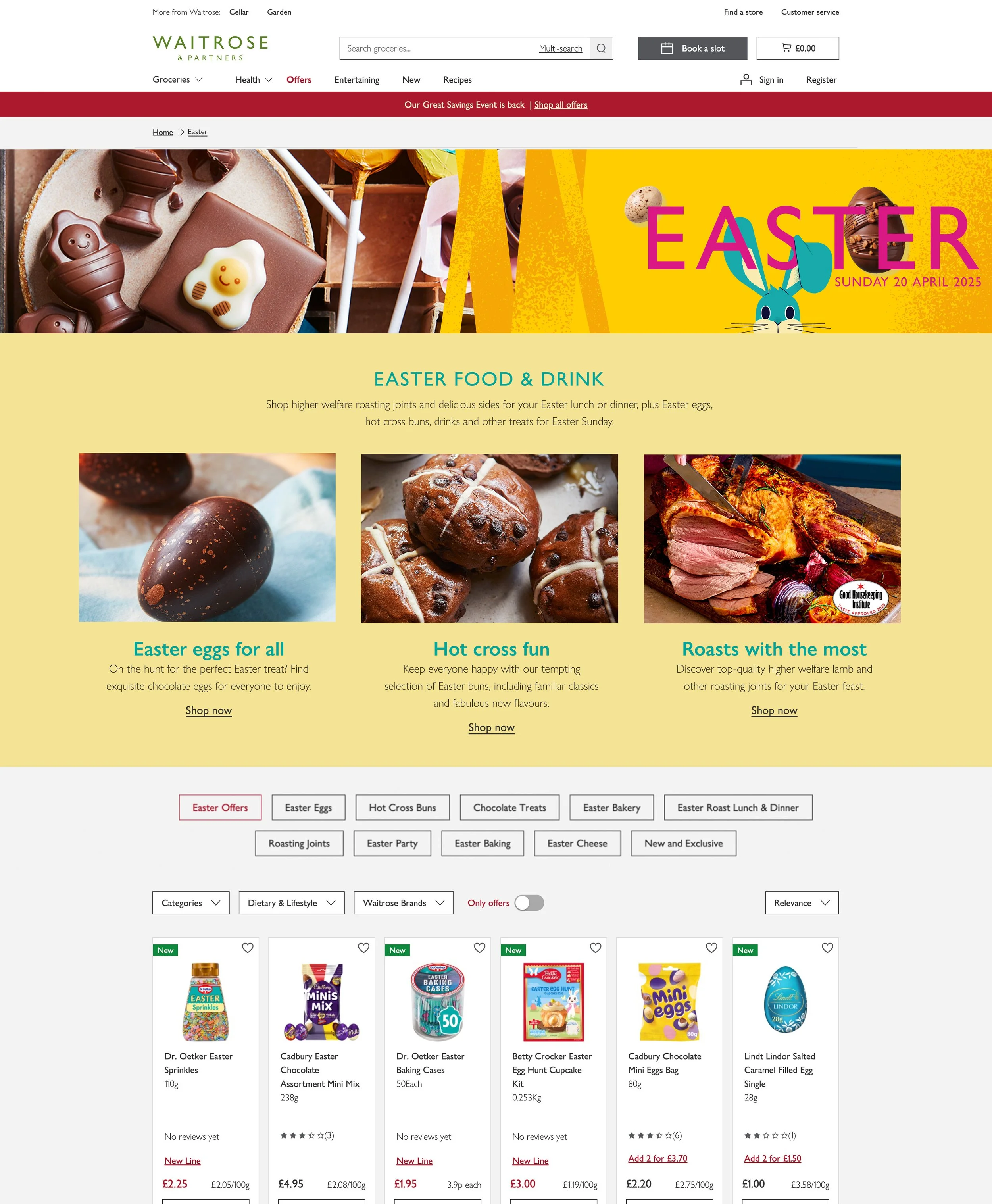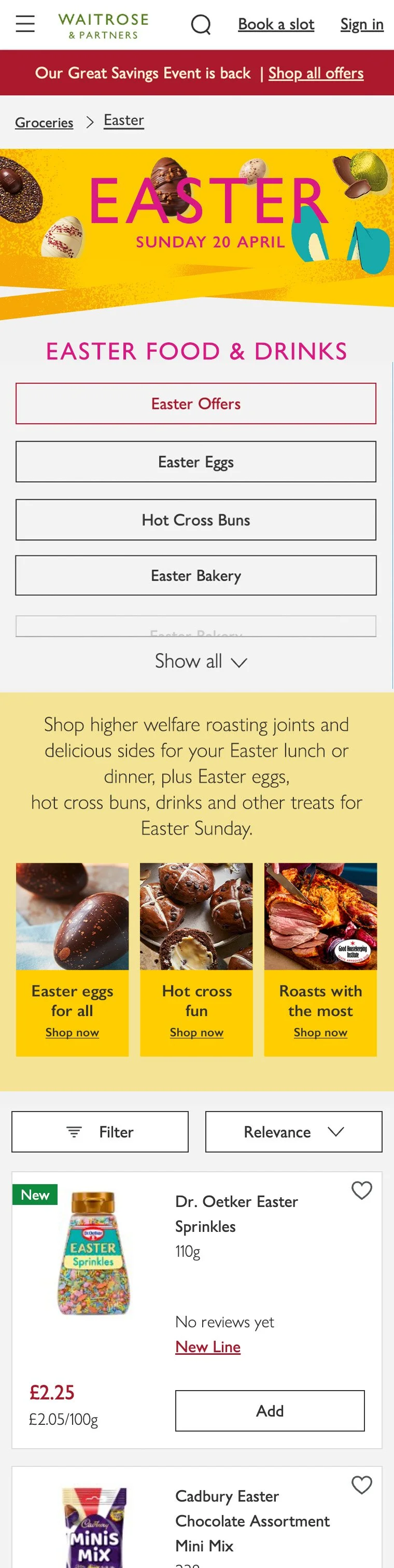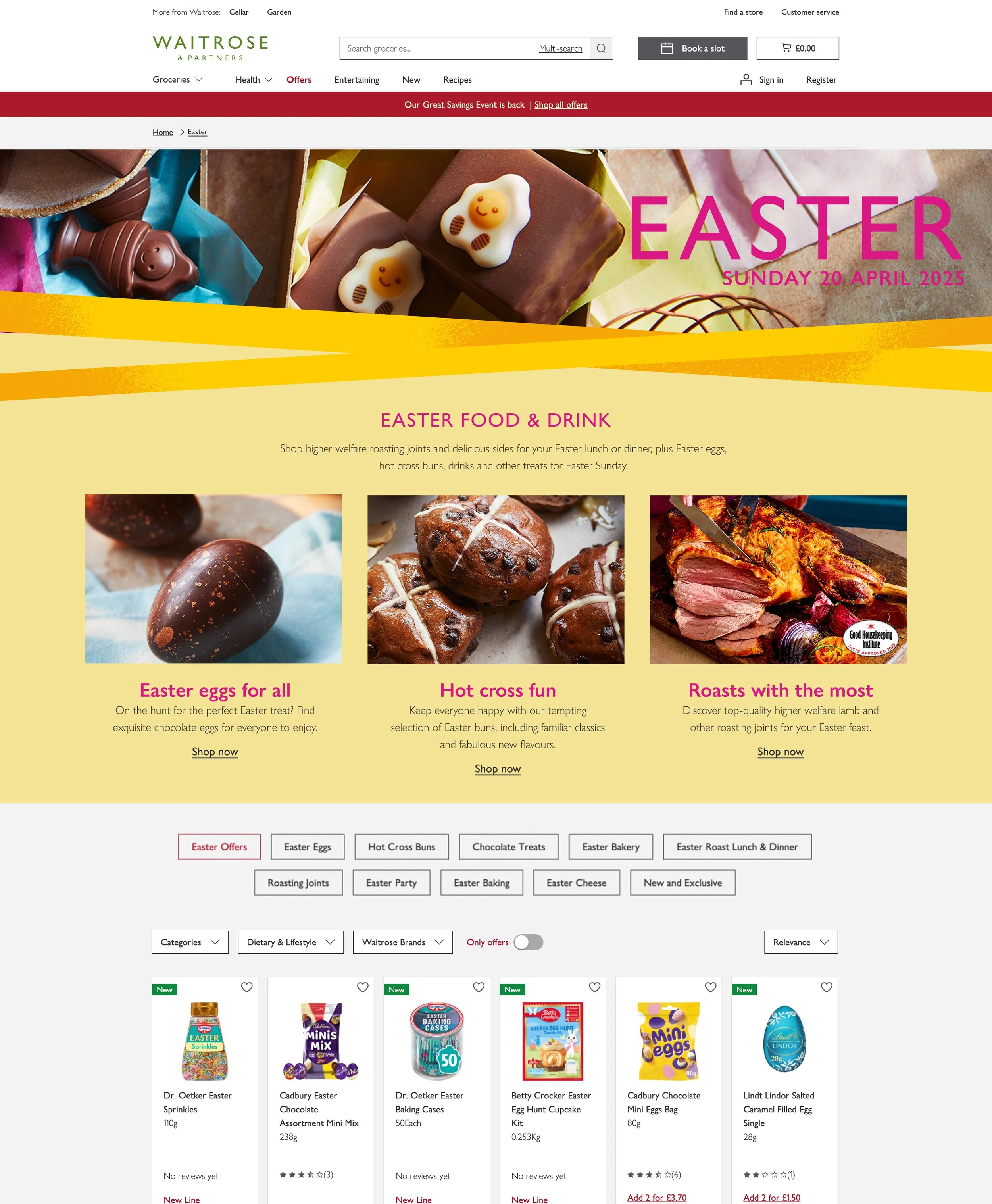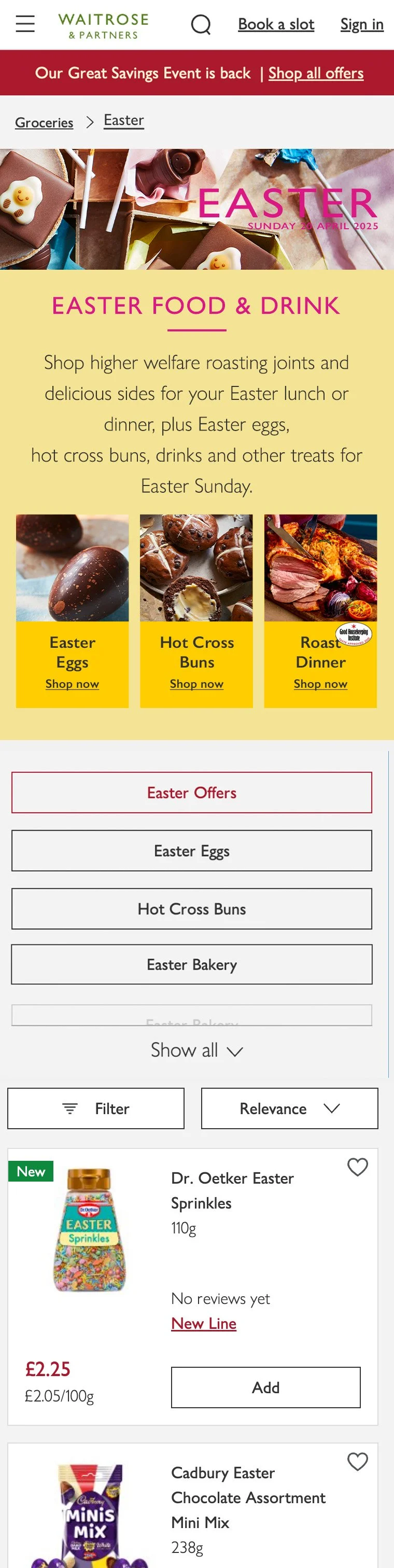 Easter is one of Waitrose’s biggest seasonal moments, with high visibility online and in-store. My role was to design a landing page that not only celebrated the festive theme but also guided users seamlessly from inspiration to purchase. This section of my portfolio focuses on the iterations I explored during the design process of the Easter Landing page, from initial concepts to the final data-informed solution. These iterations demonstrate how different design directions were tested, refined, and aligned with both user needs and commercial goals.