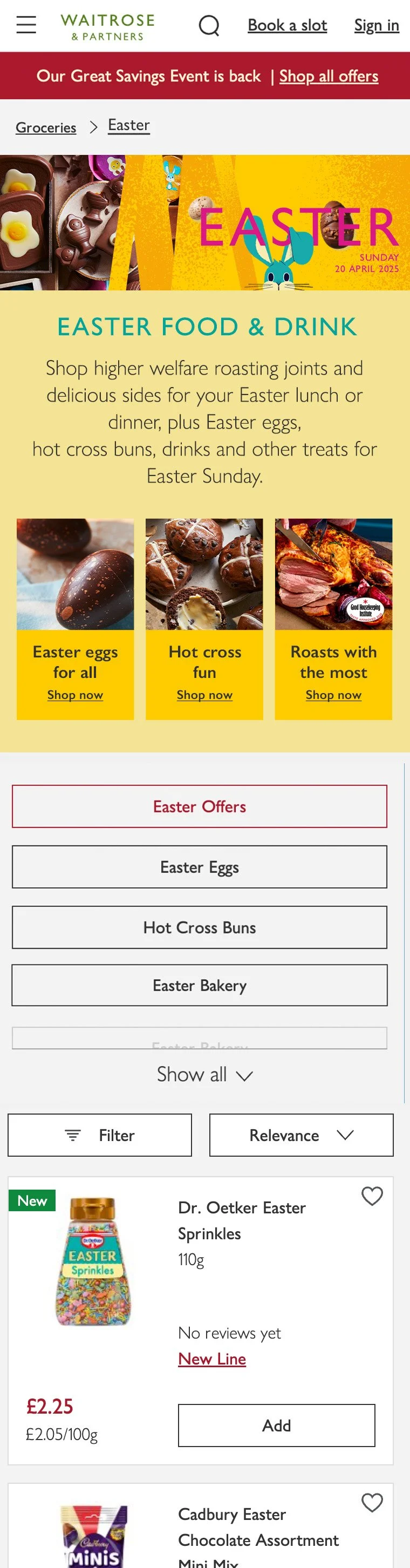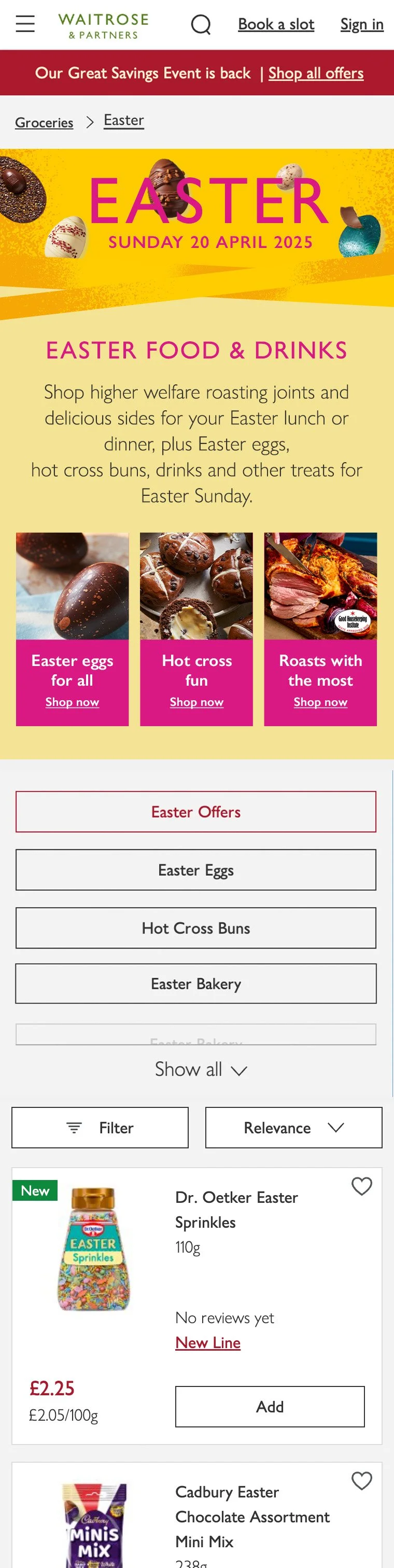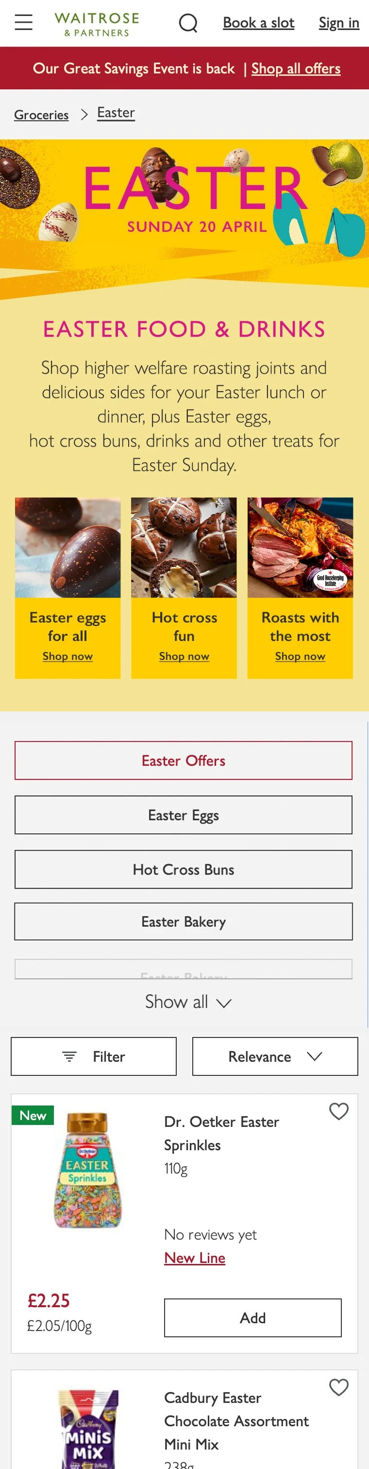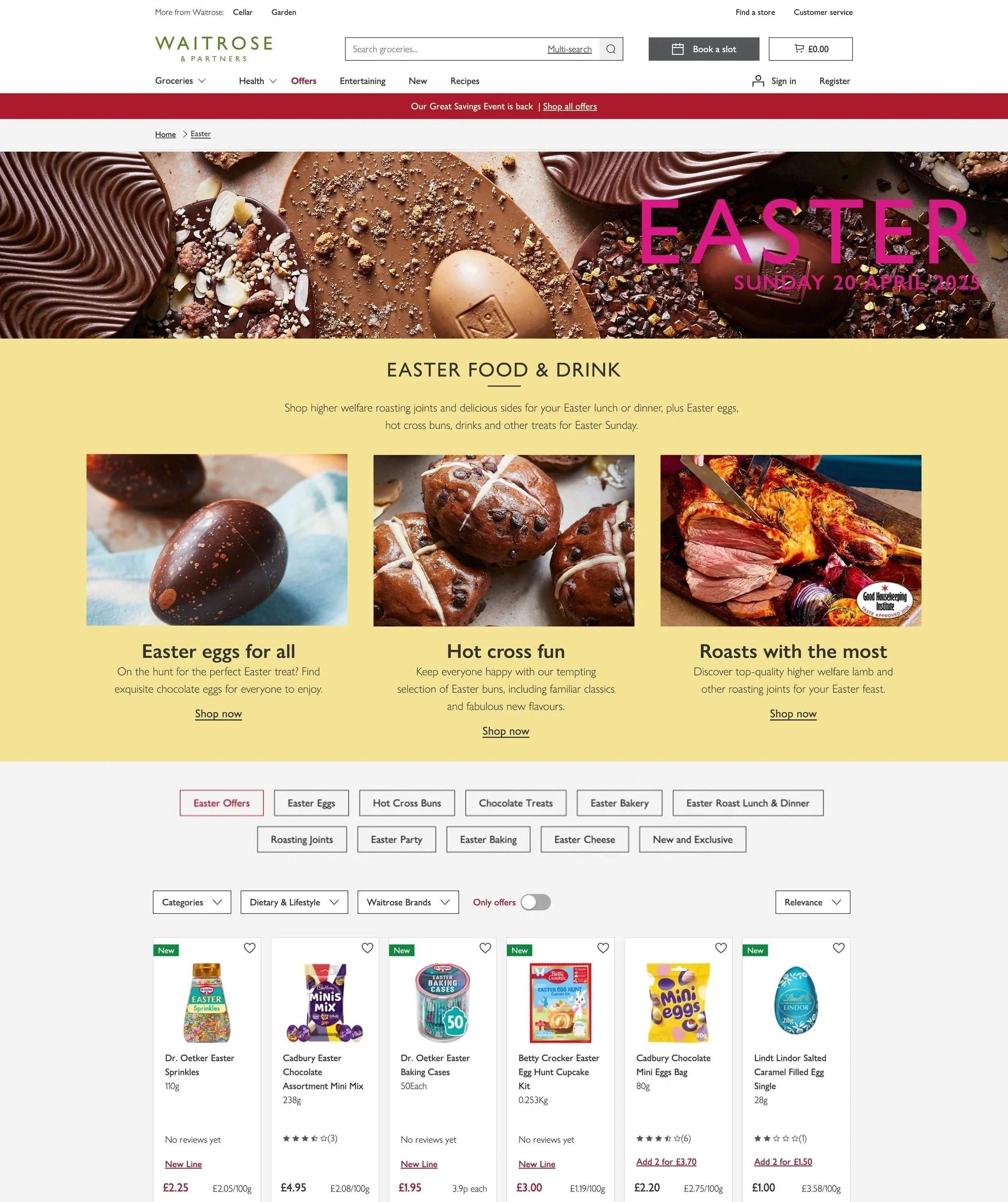 Easter is one of Waitrose’s biggest seasonal moments, with high visibility online and in-store. My role was to design a landing page that not only celebrated the festive theme but also guided users seamlessly from inspiration to purchase. This section of my portfolio focuses on the iterations I explored during the design process of the Easter Landing page, from initial concepts to the final data-informed solution. These iterations demonstrate how different design directions were tested, refined, and aligned with both user needs and commercial goals.