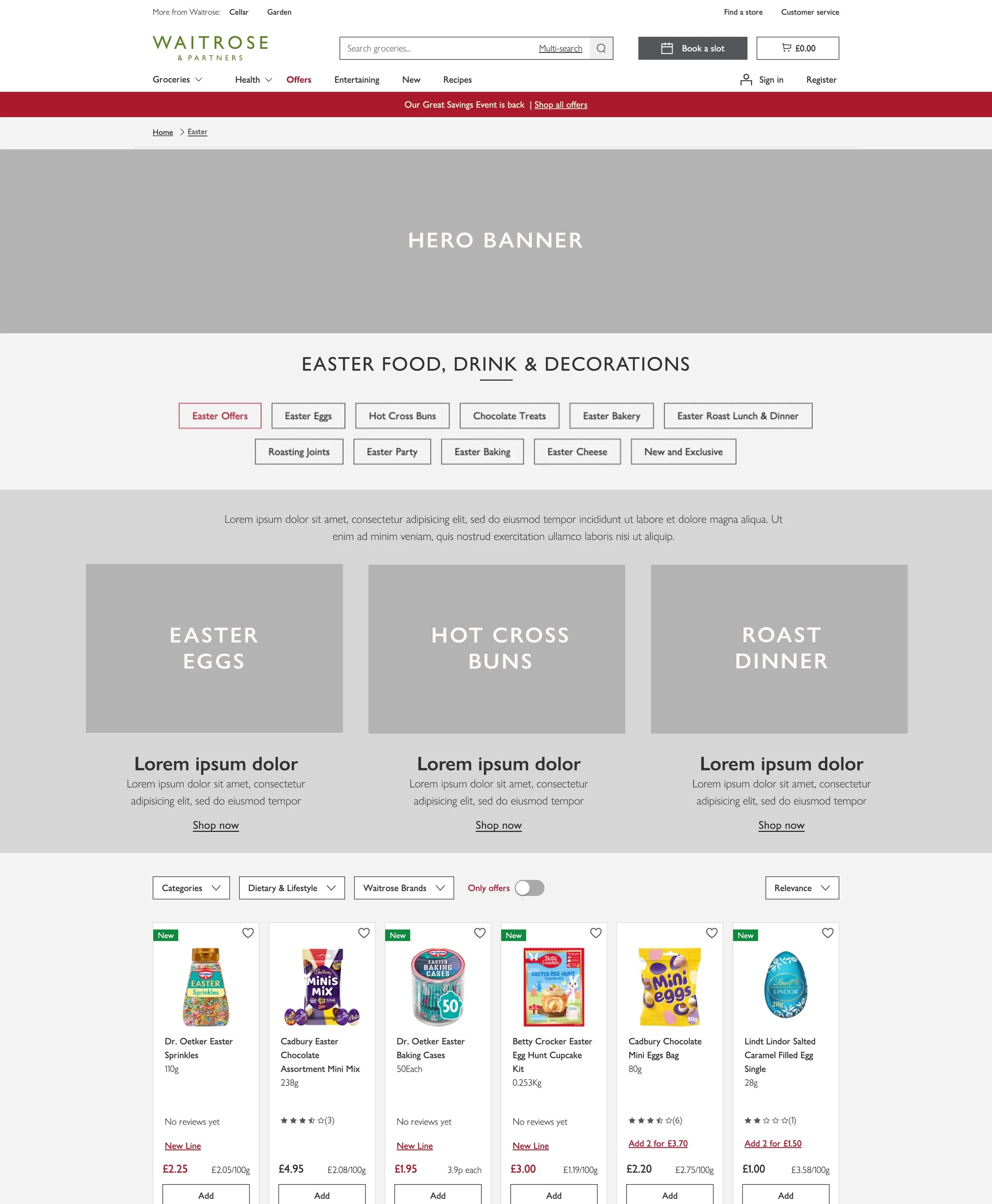 The wireframe was shaped by requirements from the trading team, who briefed the need for a hero banner, three pods highlighting the main Easter categories, and navigation buttons to help customers quickly reach specific browse aisles.