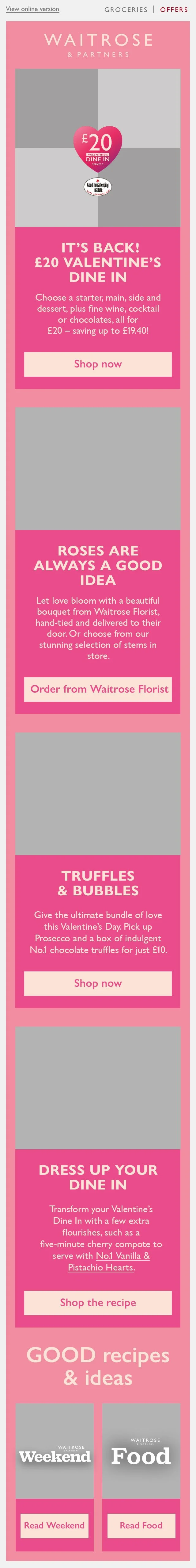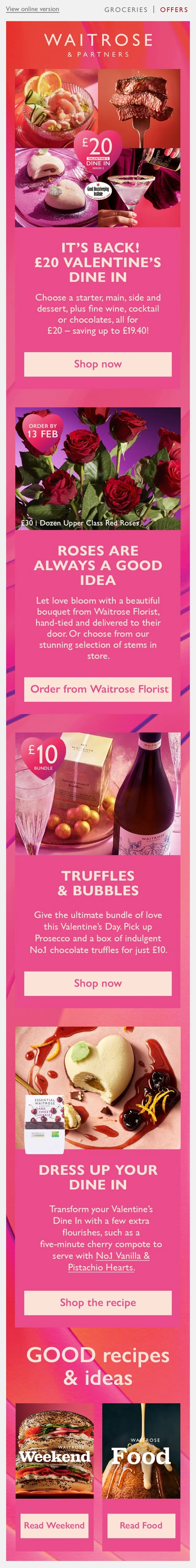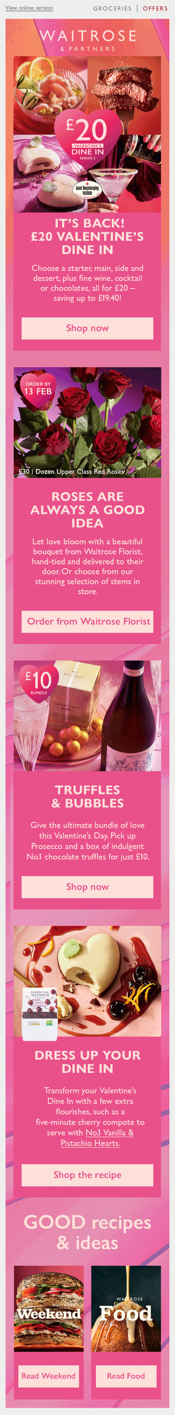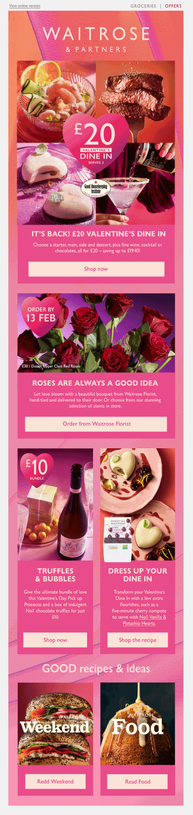This is the Valentine’s Day email that was deployed as a part of last year’s campaign, created by a colleague leading the campaign. It followed the conservative, editorial style of Waitrose’s Inspiration emails, which aimed to drive traffic through inspiring content. However, a shift in commercial goals placed greater emphasis on promoting campaign shelves and hero products, creating the need for a bolder, more impactful design approach,