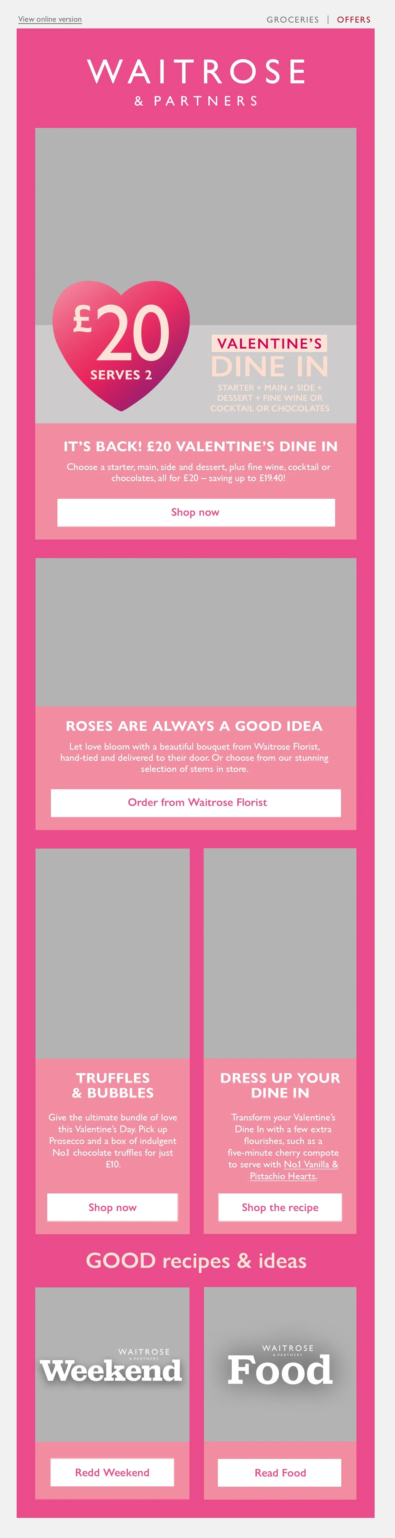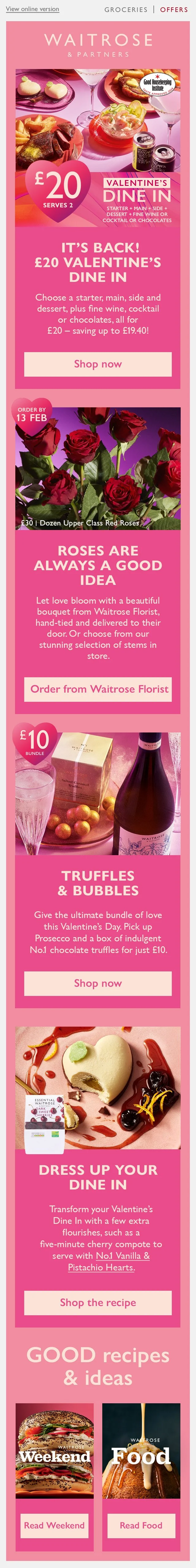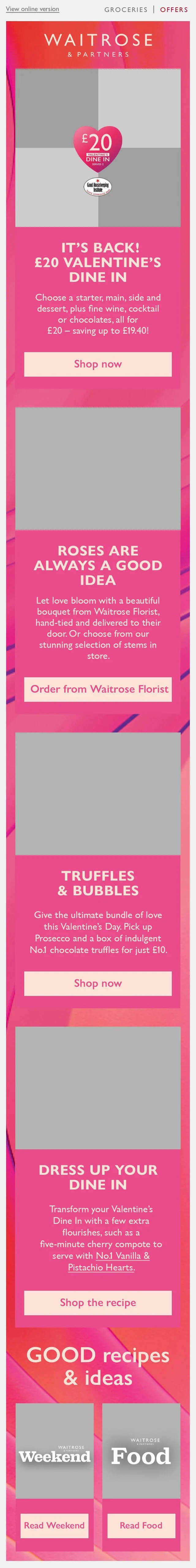 This is the Valentine’s Day email that was deployed as a part of last year’s campaign, created by a colleague leading the campaign. It followed the conservative, editorial style of Waitrose’s Inspiration emails, which aimed to drive traffic through inspiring content. However, a shift in commercial goals placed greater emphasis on promoting campaign shelves and hero products, creating the need for a bolder, more impactful design approach,