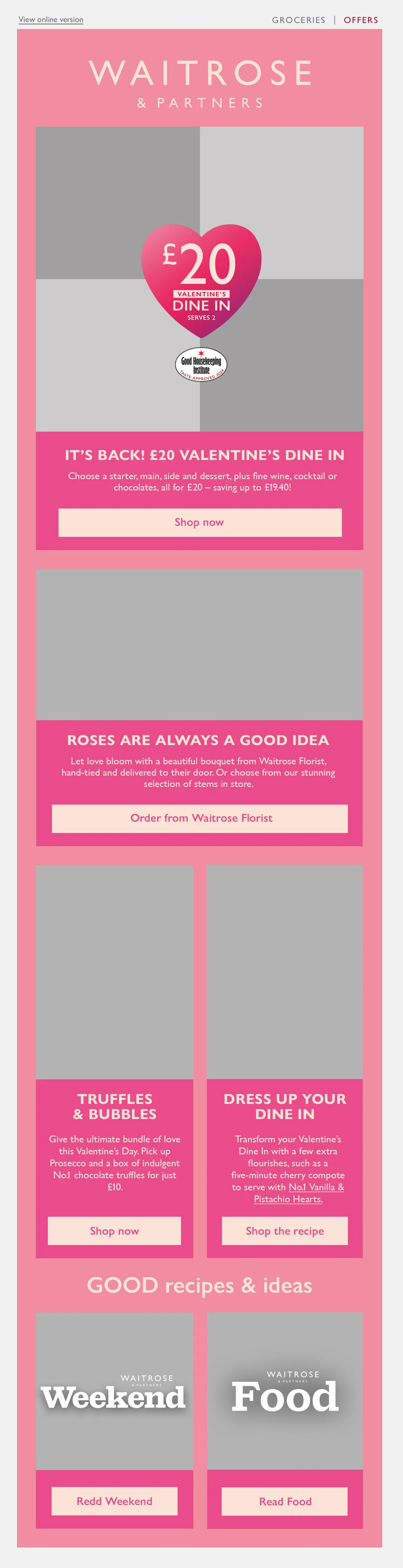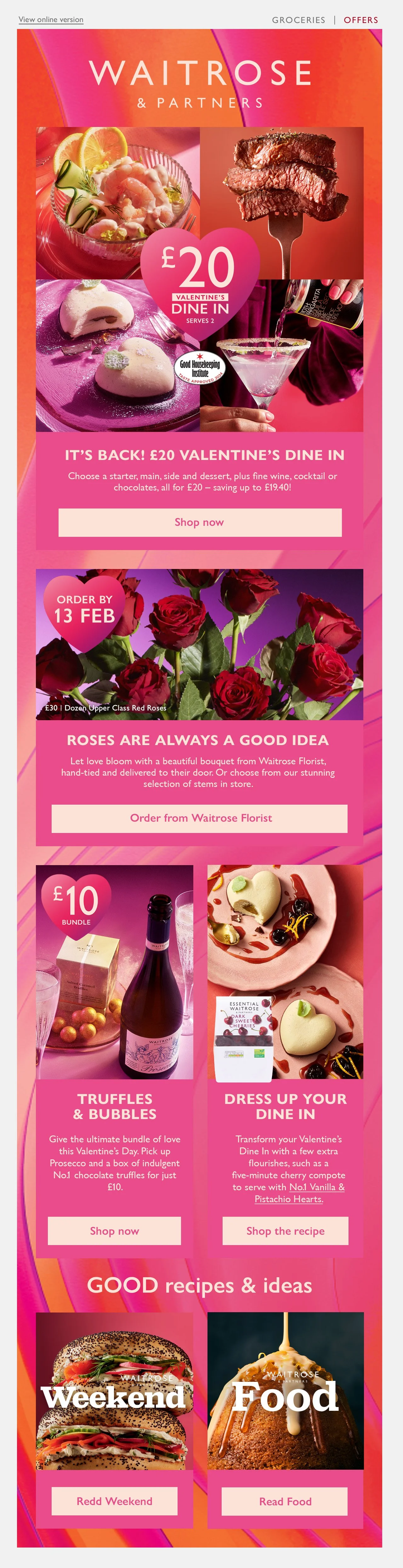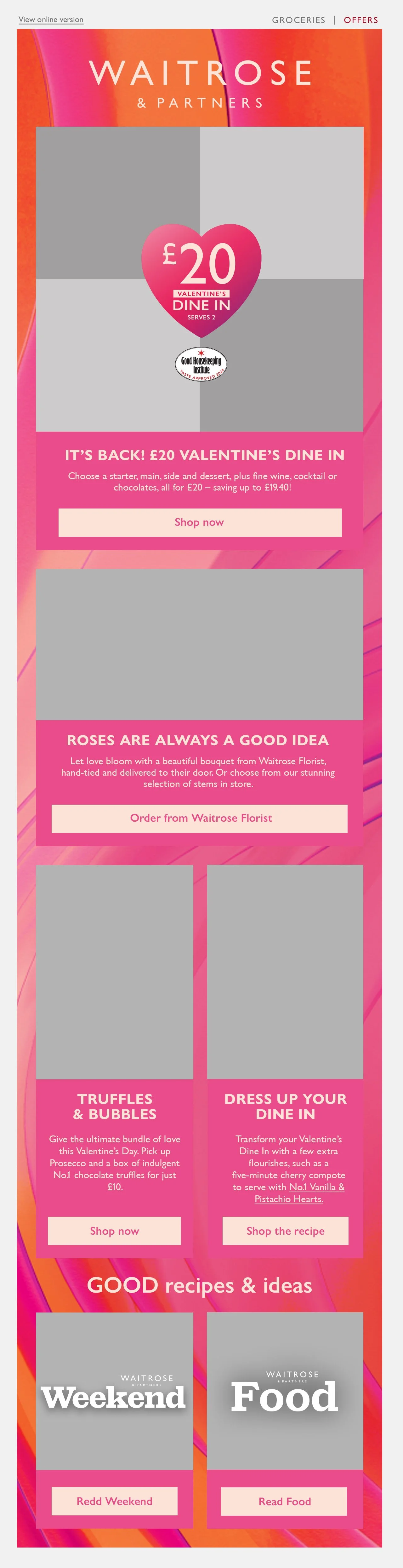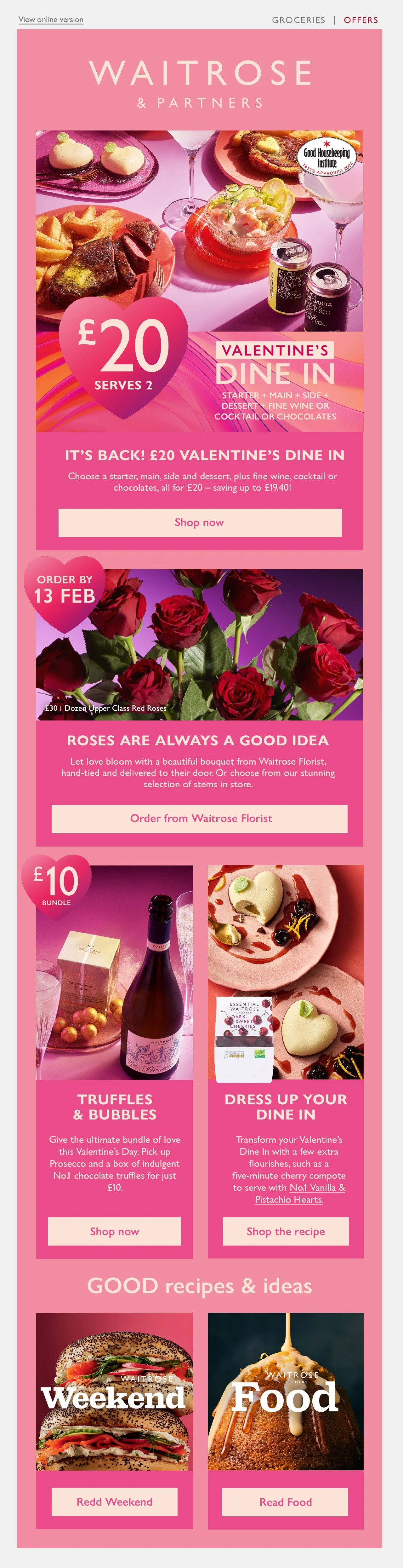This is the Valentine’s Day email that was deployed as a part of last year’s campaign, created by a colleague leading the campaign. It followed the conservative, editorial style of Waitrose’s Inspiration emails, which aimed to drive traffic through inspiring content. However, a shift in commercial goals placed greater emphasis on promoting campaign shelves and hero products, creating the need for a bolder, more impactful design approach,