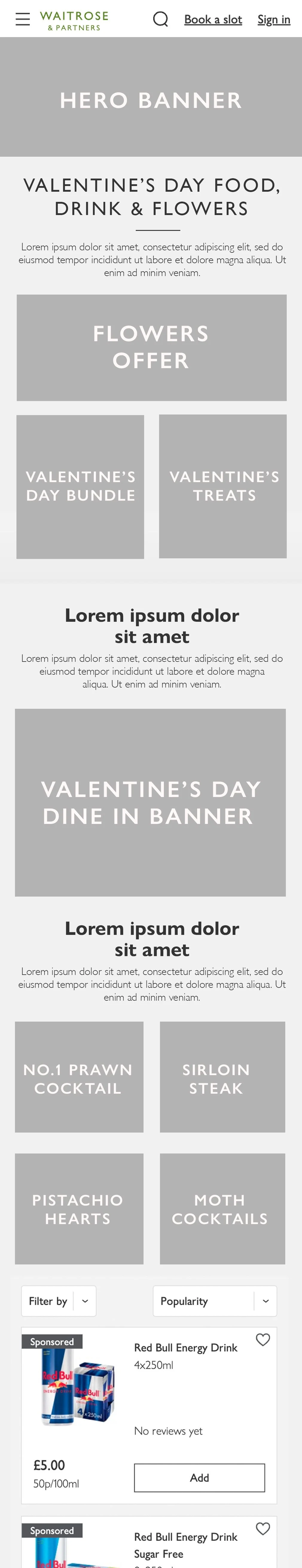 I mapped two routes for the Valentine’s Day landing page based on the trading team's requirements. Both featured a consistent hero, SEO title, and pods calling out Valentine’s Day related offers, with variations in how the meal deal and hero product pods were formatted for clarity and impact.
